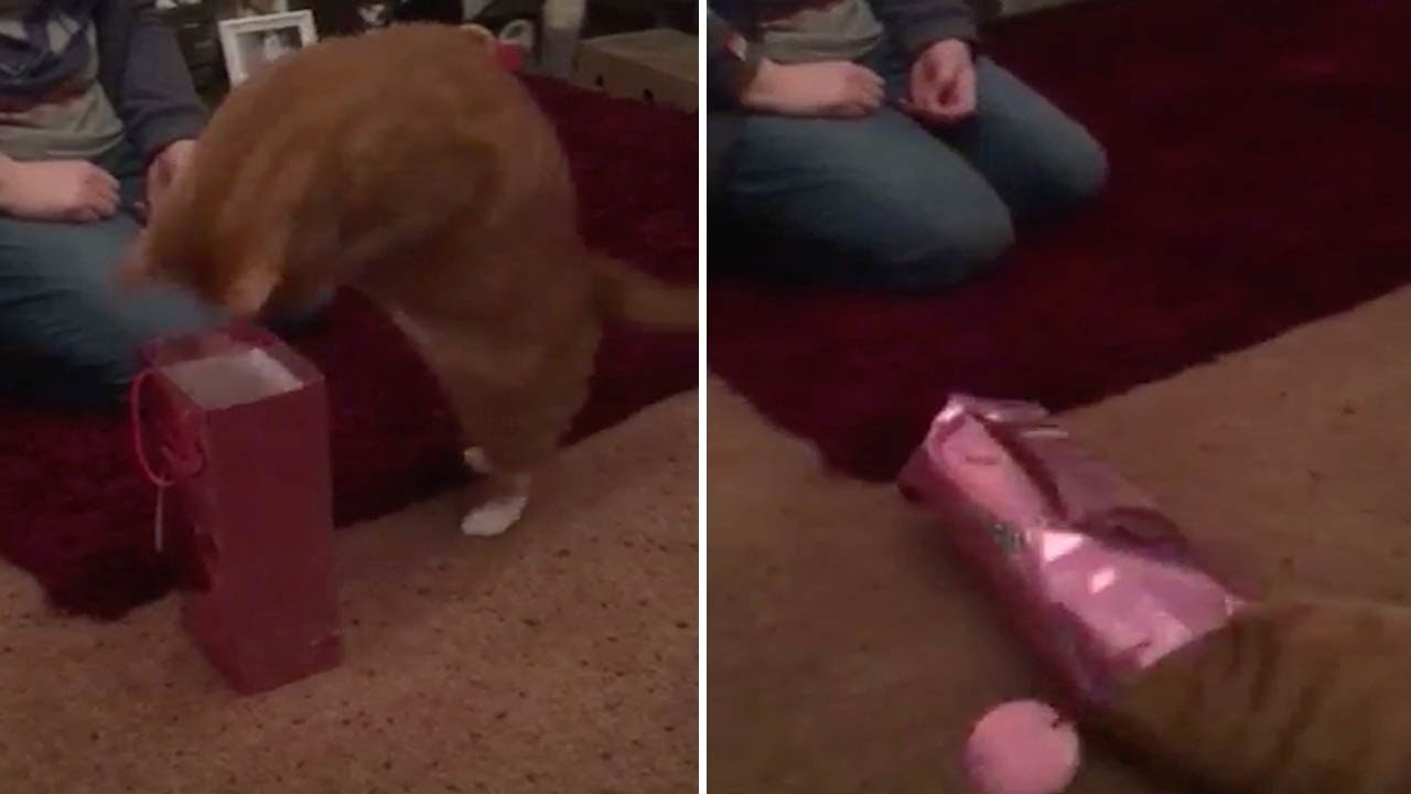 Amanda Nelson shared this short but hilarious video of her chubby ginger tabby cat, Gabriel, diving face first into a tall and narrow wine gift bag in an attempt to retrieve a toy mouse.