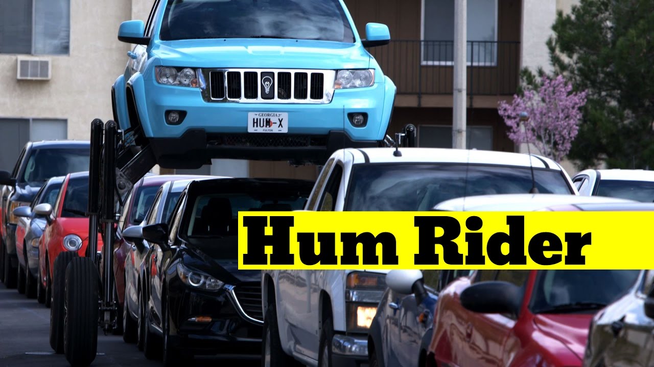 “Stuck in a traffic jam? Hum Rider is here to help. With the push of a button, Hum Rider widens and elevates and lets you drive over cars in front of you. Problem solved.”