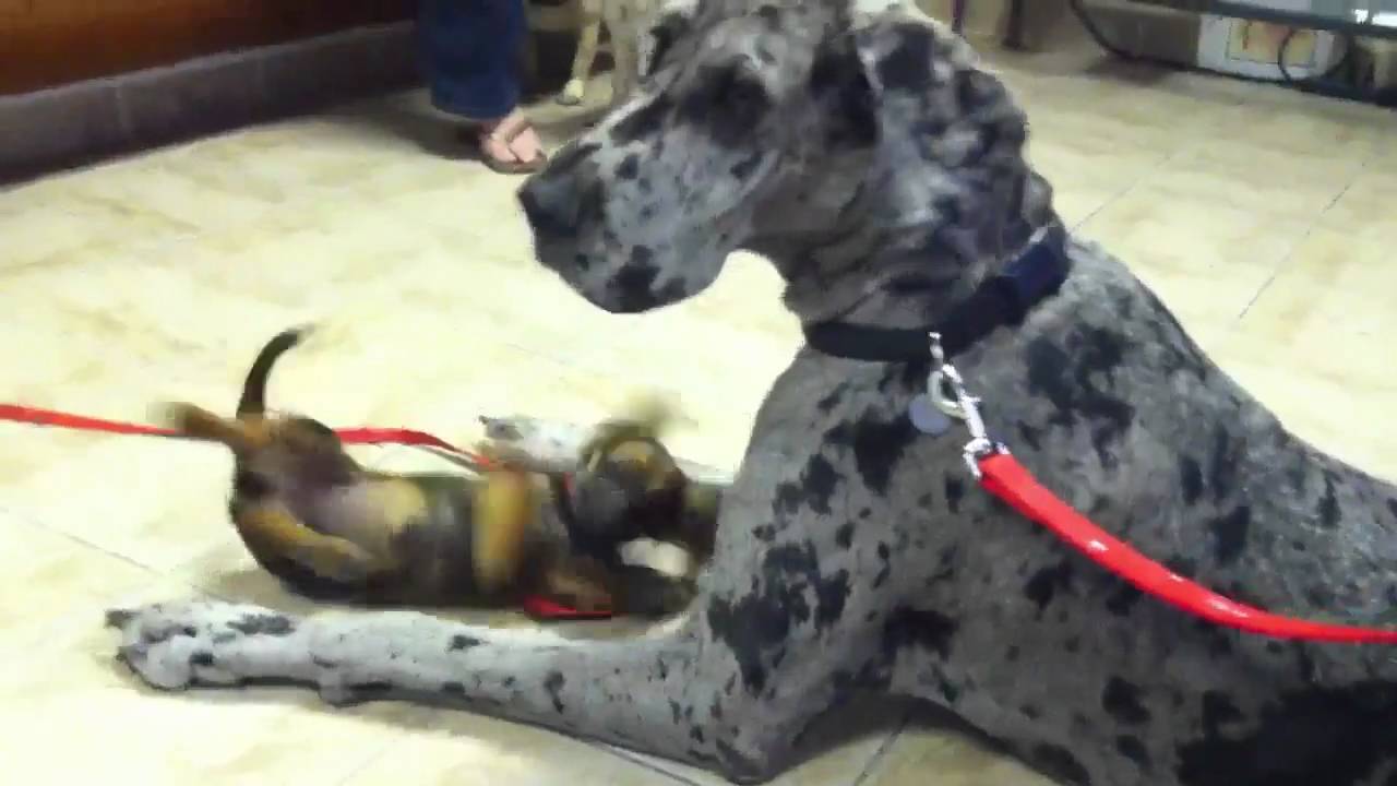 While waiting for his turn at the veterinary clinic, Shadow, the gentle great dane, patiently puts up with the hyper antics of a rambunctious long-haired dachshund puppy.