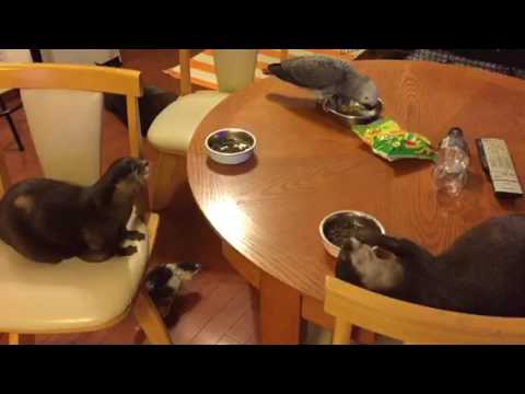 In this adorable video from Japan, two Asian small-clawed otters happily munch on their kibble while a duck gobbles up dropped scraps, and an African grey parrot snacks on seeds.