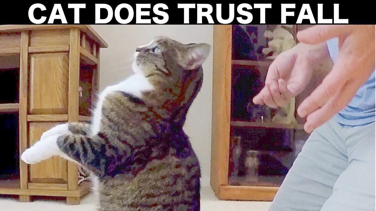 Didga, the cat, (short for didgeridoo) has learned the amazing trick of “trust falling” backwards into the hands of her human and trainer, Robert Dollwet.