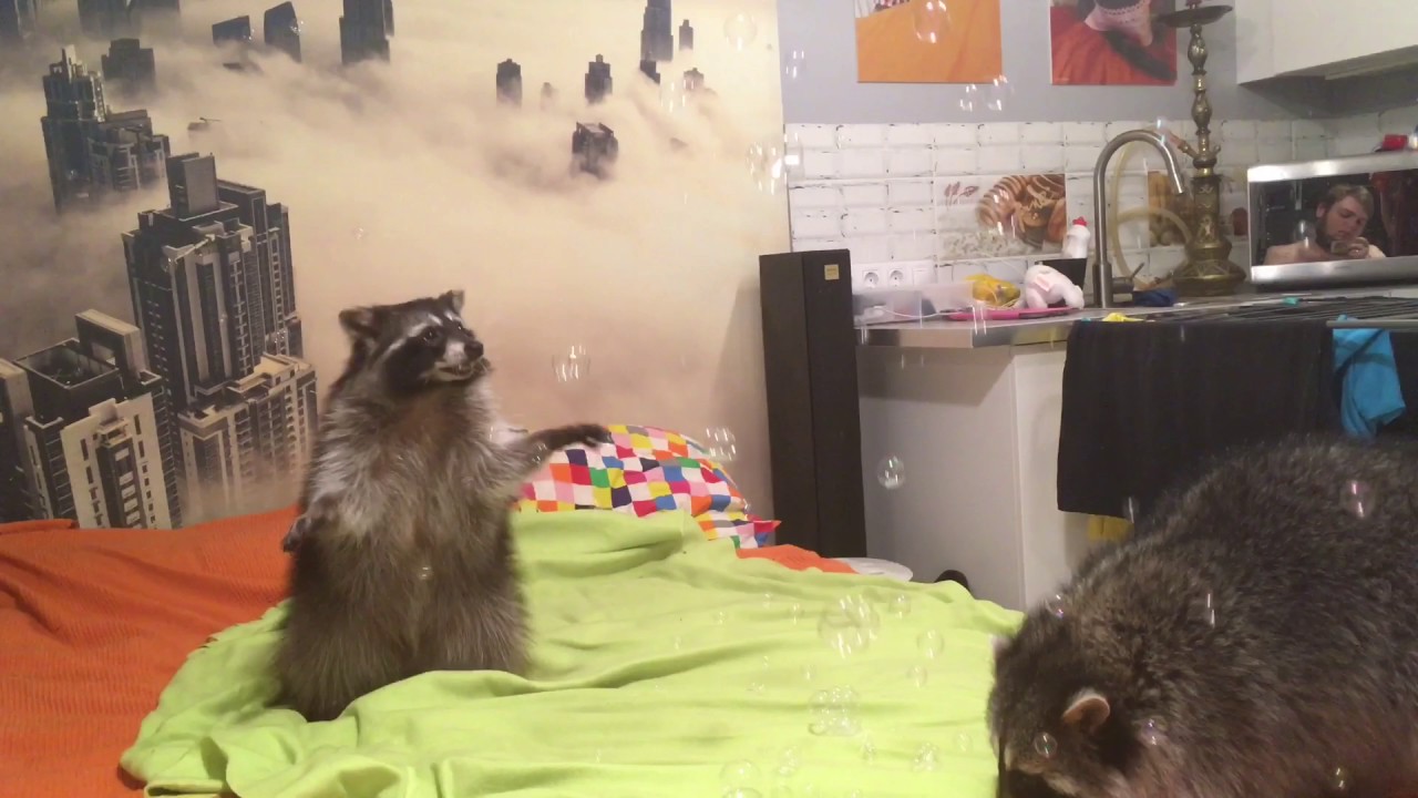 In this cute video from Russia, a pair of fluffy pet raccoons, named Fury and Funny, hop around their owner’s bed as they try to catch falling soap bubbles. See more of these adorable raccoons on their Instagram page.