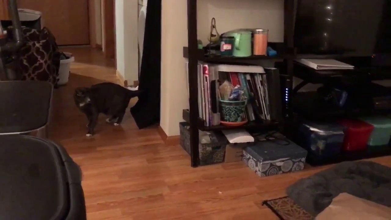 YouTube user Klelnase shared this amusing video of how their prankster cat Belle likes to jump out from behind a curtain to scare her sister, Addie, when she walks by.