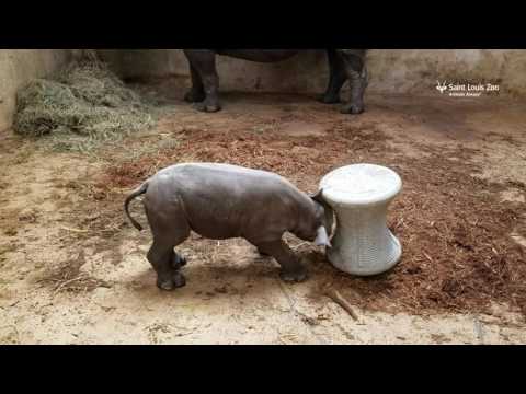 The Saint Louis Zoo in Missouri shared this cute footage of their new two-week-old black rhinoceros calf, named Moyo, practicing his charging skills on one of his enrichment toys.