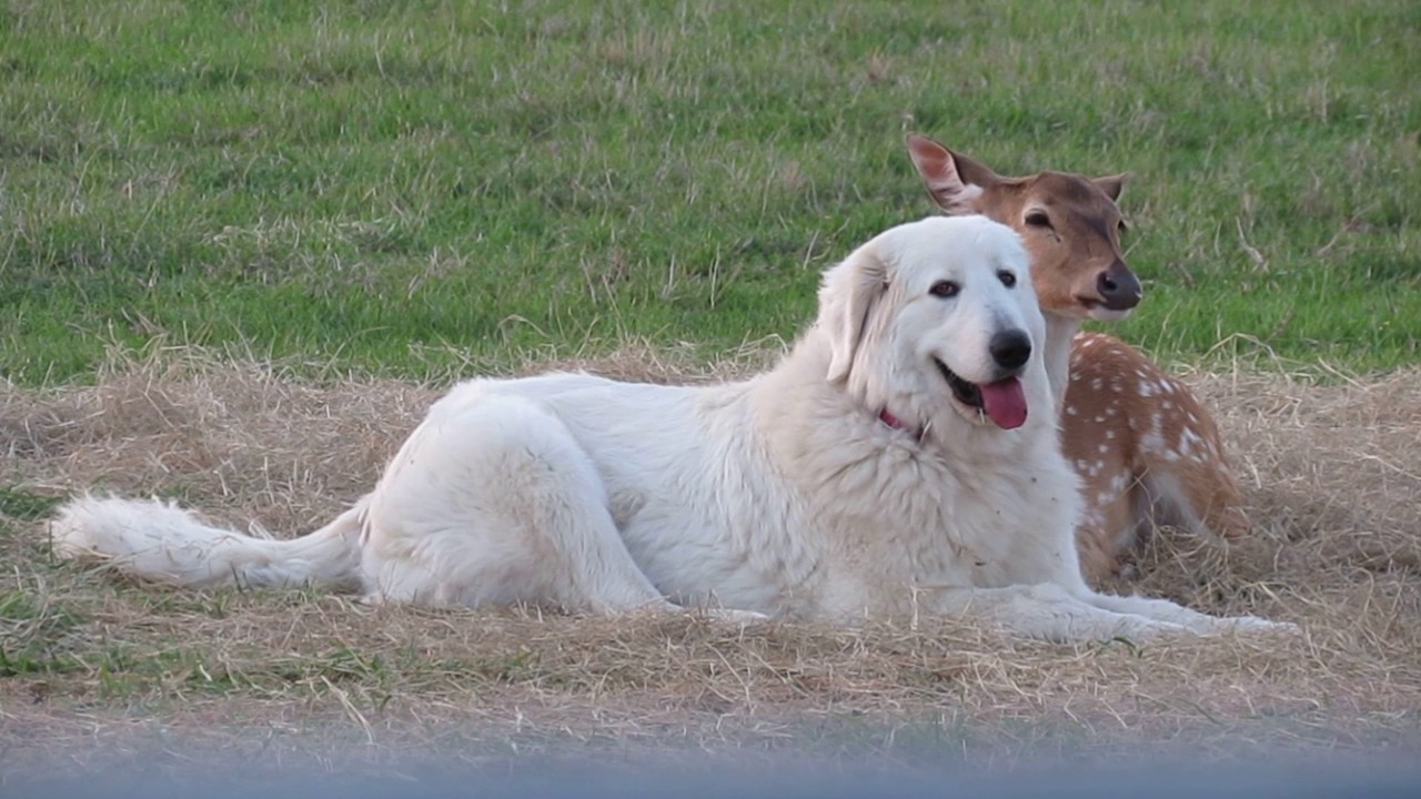 Tracy Chell from Tracy’s Ark Ranch in Medina, Texas, shared this cute video of her gentle Italian Maremma sheepdog, Francesca, hanging out with her new best friend, Donnie, the young axis deer. In another video from Tracy’s Ark Ranch, below, Amber, the baby goat, has fun climbing all over Giovanni, the Maremma sheepdog.