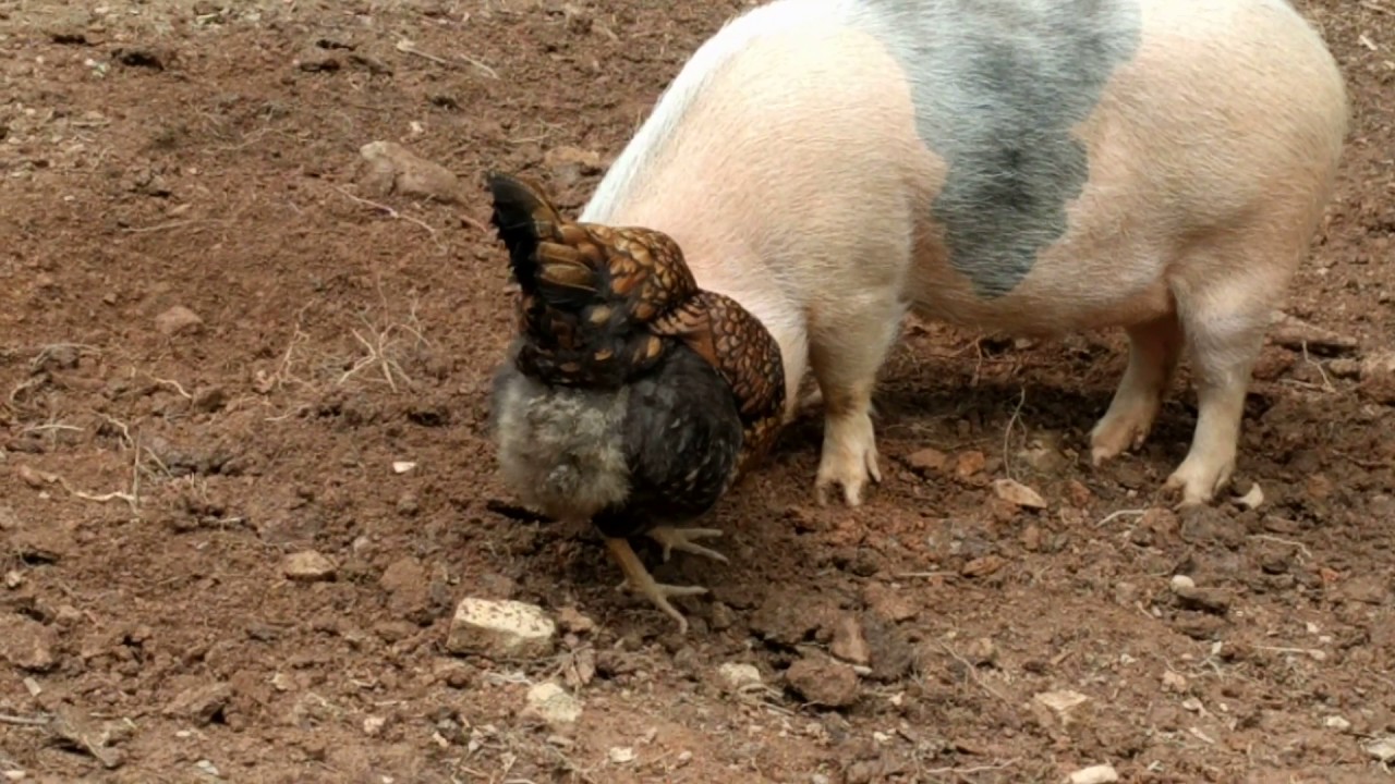Todd Sharp from Blairsville, Georgia shared this sweet video of his pet pig, Milton, teaming up with his chicken pal to dig through the dirt for some lunch.