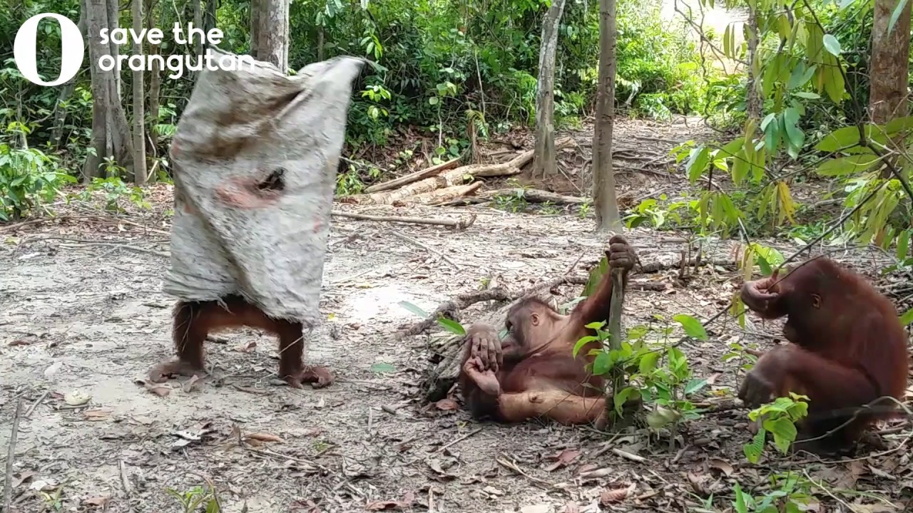 Save the Orangutan shared this cute video, from the Nyaru Menteng orangutan rehabilitaiton center near Palangka Raya, Indonesia, of a playful young orangutan wearing a canvas bag like a ghost costume to sneak up on his friend and convince him to play.