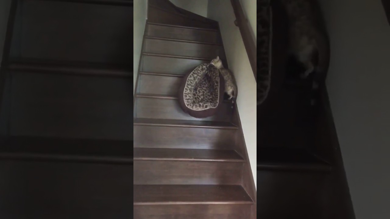 Cat Carries Her Bed Upstairs
