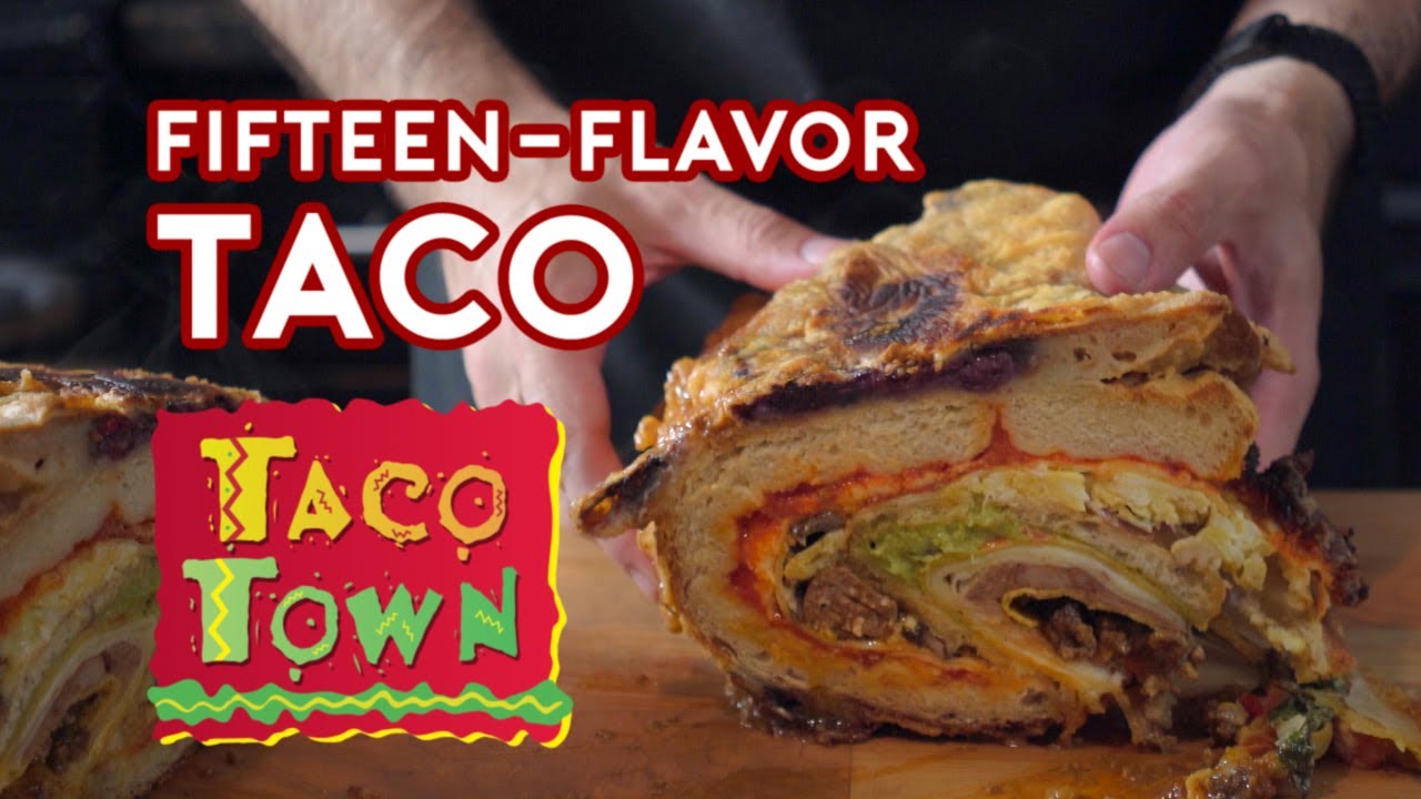“Thank you everyone for helping me reach 1 million subscribers! Take a sordid peek behind the curtains of BwB and see how I make the show each week. Then, join me as I endeavor to stack as many Mexican, French, Italian, and American layers into one beer-battered monstrosity known as the Pizza Crepe Taco Pancake Chili Bag.”