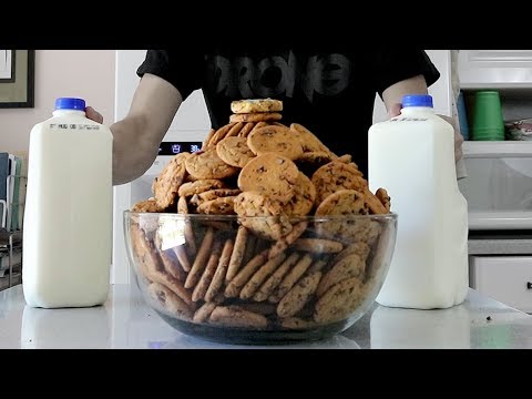 For his latest personal food challenge, San Jose, California-based professional competitive eater Matt “Megatoad” Stonie tests how quickly he can eat 203 chocolate chip Chips Ahoy cookies and drink one gallon of milk, which totals a whopping 12,800 calories.