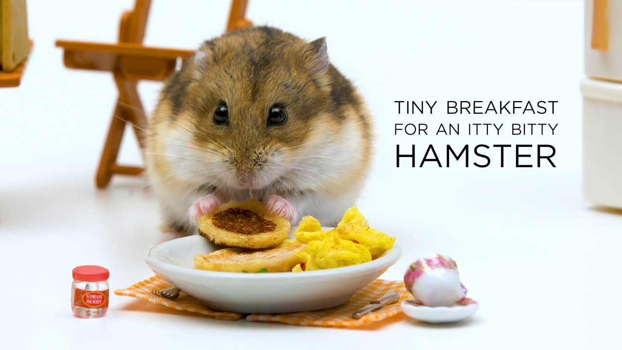 Tiny Hamster Enjoys a Tiny Pancake and Egg Breakfast