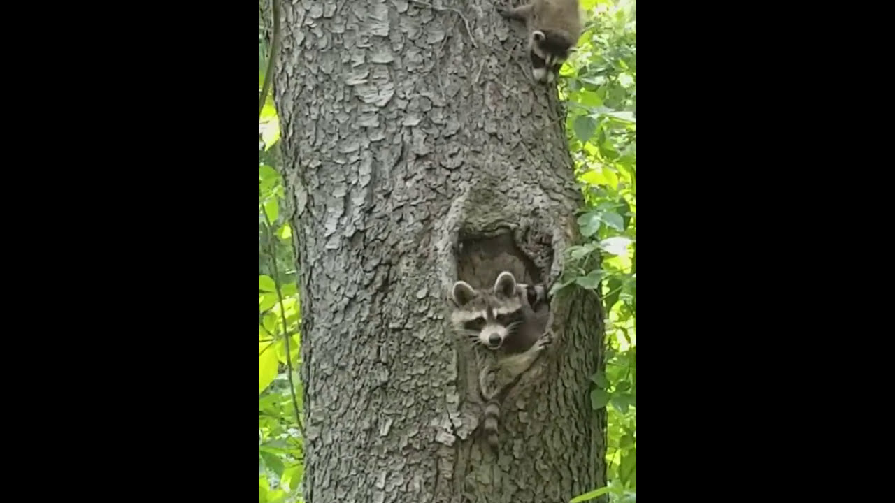 In this amusing video from Leesburg, Virginia, a mother raccoon has a difficult time getting one of her rambunctious babies to go inside their tree den for naptime.