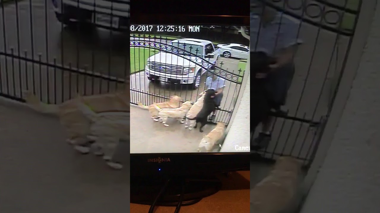 A security camera on a home in Pasadena, Texas, captured this sweet footage of a kind mailman taking time to say hello and give heads scratches to five happy dogs.