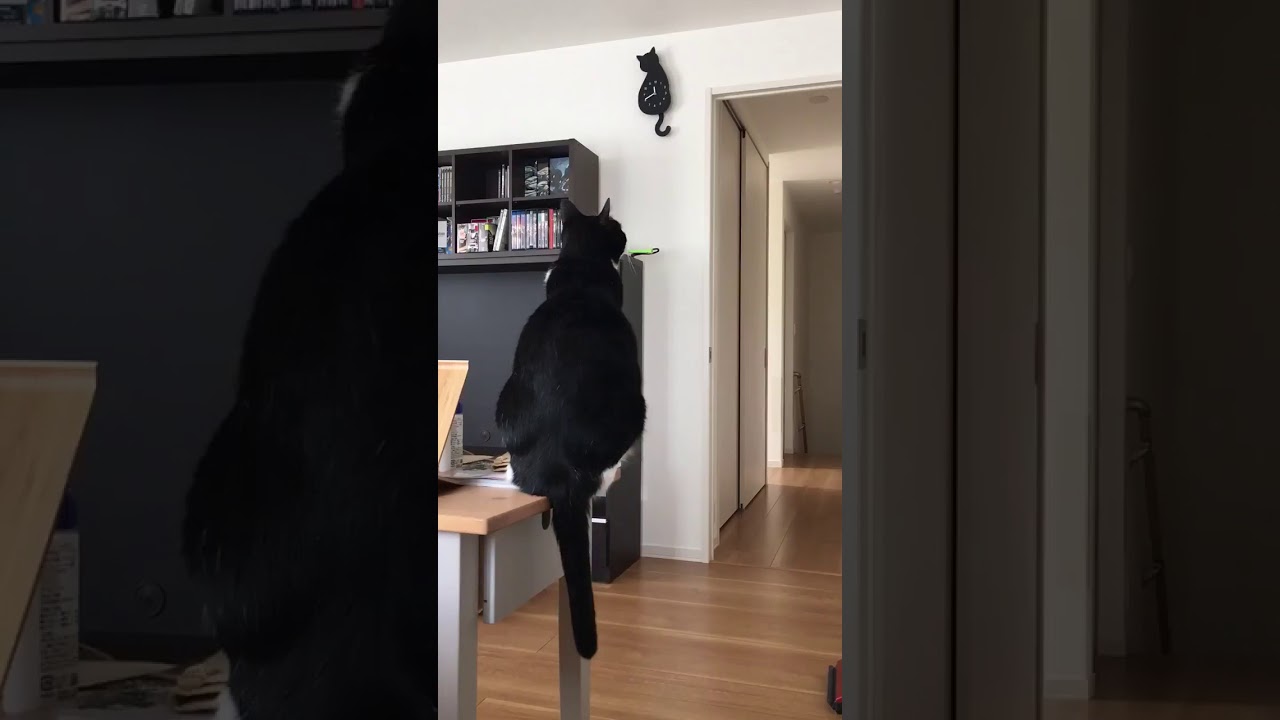 In this amusing video, a black and white tuxedo cat notices cat-shaped wall clock, then proceeds to almost perfectly mimic the clock’s pendulum tail.