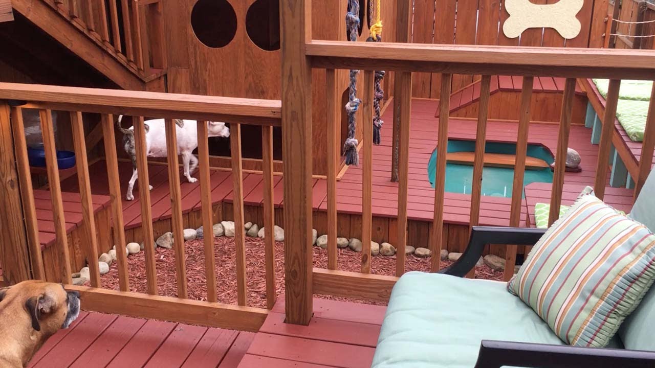 DIY-loving dad, Aaron Franks, gives a guided tour of the elaborate pirate-themed palace he built for his four spoiled pit bulls, that’s complete with a swimming pool, rope swings, a water dispenser, tunnels, and more.