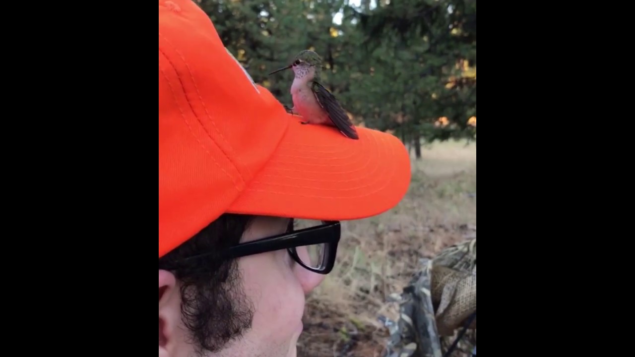 In this amusing video from Wallowa County, Oregon, a confused hummingbird mistakes a guy’s bright orange hat for a flower and attempts to draw nectar from the hat’s small ventilation holes.