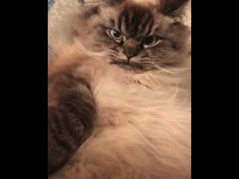 Even while relaxing, this majestically fluffy ragdoll cat, named Merlin, has a perpetual look on his face that says “death to all humans.”