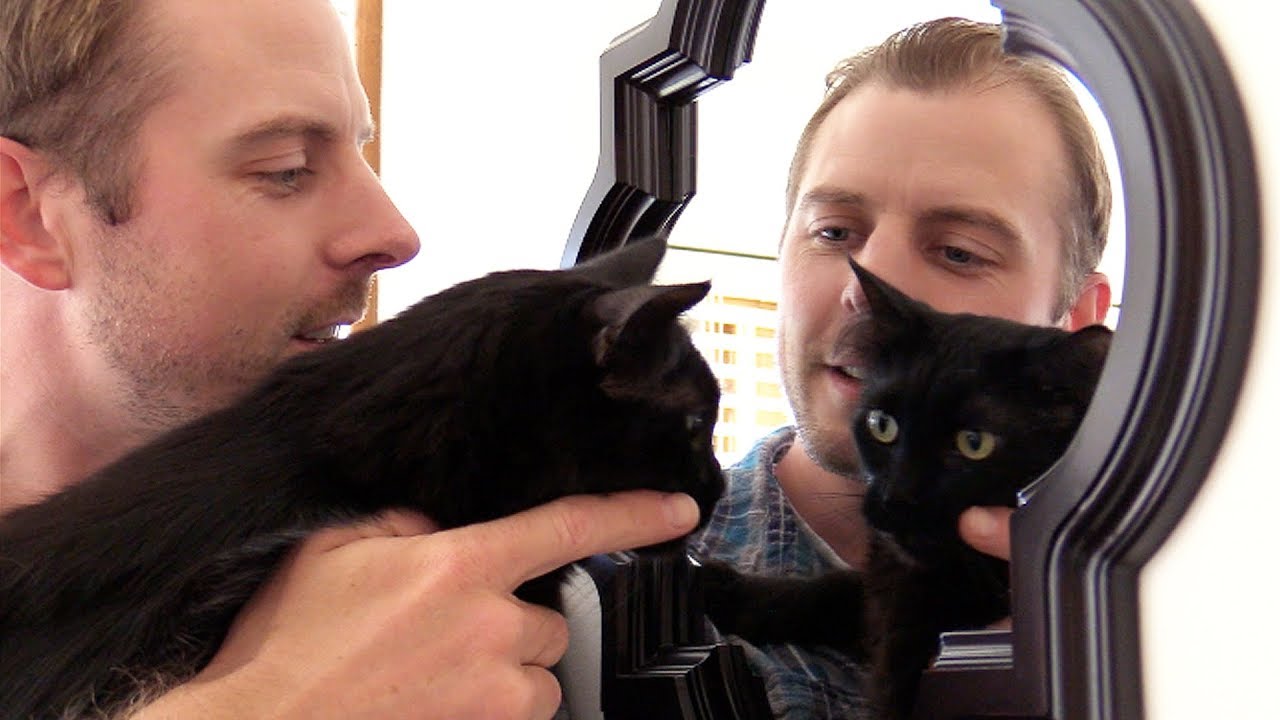 With help from his cute cats, Cole (black) and Marmalade (ginger), Chris Poole demonstrates some of the things that just about every cat owner does on a regular basis.