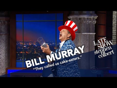 In this clip from Thursday night’s episode of The Late Show, legendary actor and comedian Bill Murray unexpectedly bursts into the Ed Sullivan theater to surprise the Late Show audience with t-shirts, then sits down with host Stephen Colbert to drink Cuban rum in honor of the Chicago Cubs and discuss his large family.