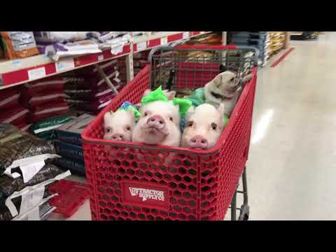 Four mini pigs from Florida, Priscilla, Poppleton, Posey, and Pink, and their pug pal, Pigtail, help their human shop for food at a local Tractor Supply Co. store. See more of this crew on Instagram.