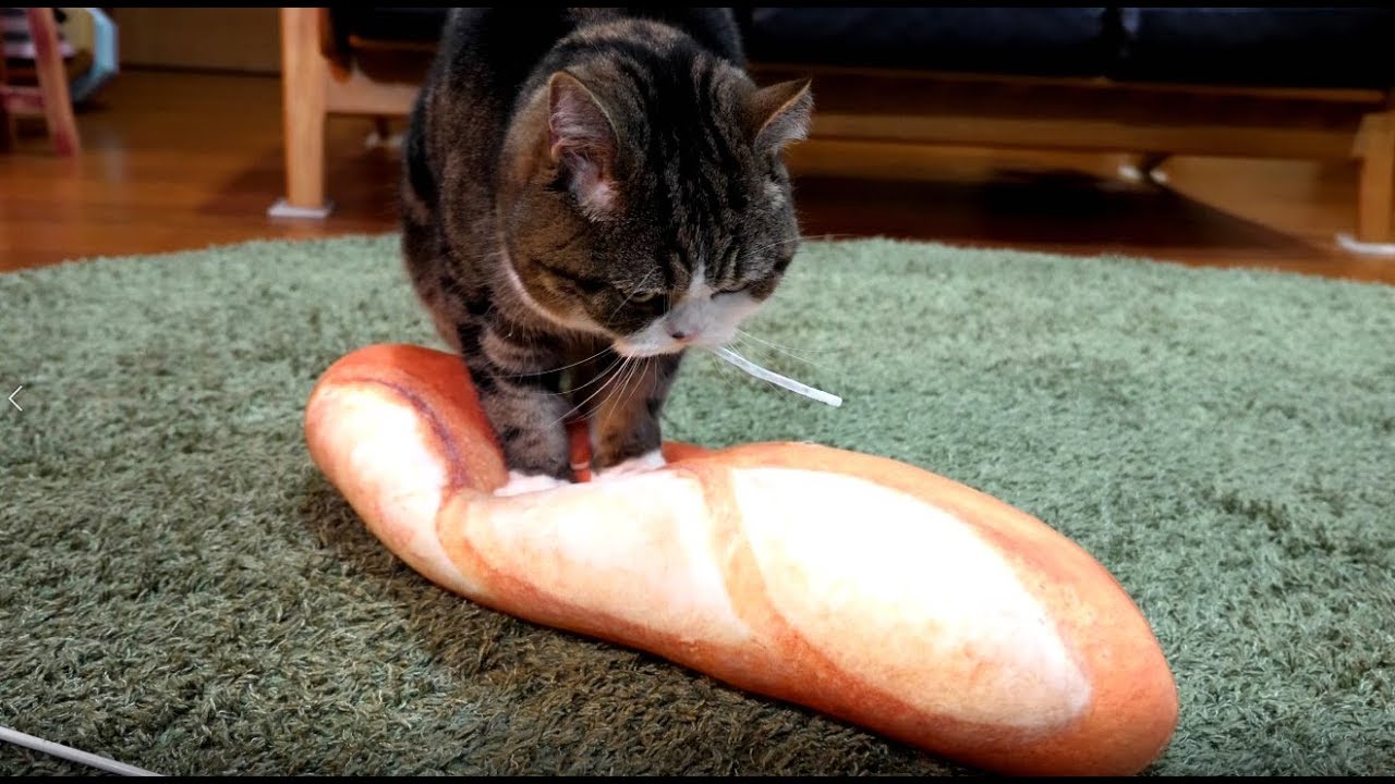 Maru, the famous feline from Japan, takes a break from squeezing himself into small containers to hilariously knead a realistic-looking bread pillow.