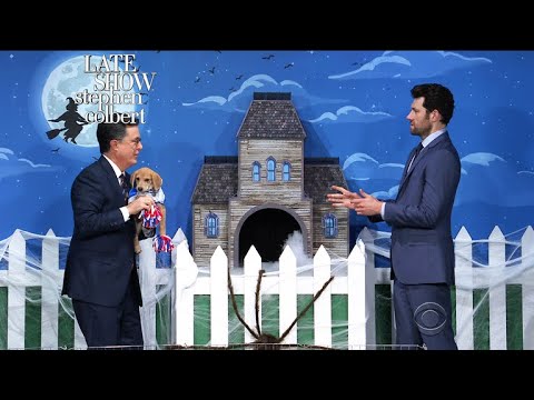 In the latest edition of The Late Show‘s “Rescue Dog Rescue” segment, host Stephen Colbert and comedian Billy Eichner tell the interesting backstories of adorable costume-wearing puppies, who are up for adoption at North Shore Animal League America in Port Washington, New York.
