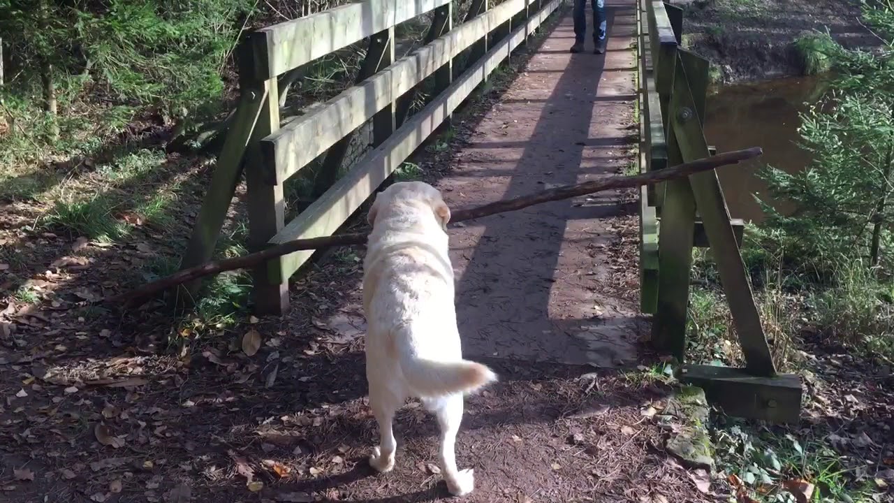 While hiking along Mallards Pike Lake in Gloucestershire, England with his humans, Dylan, the labrador retriever, found the perfect stick that he wanted to take home with him, but the poor pooch some difficulties carrying it across a narrow footbridge.