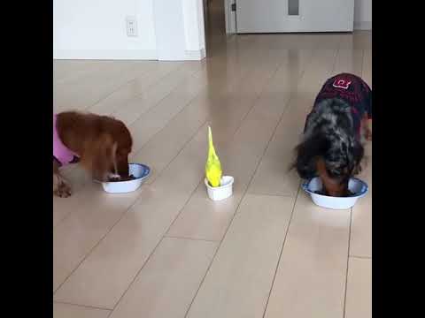 In this short but cute video from Sapporo, Japan, a little yellow parakeet runs into the kitchen to join his dachshund housemates for supper.
