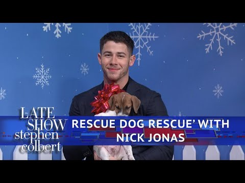 In the latest edition of The Late Show‘s “Rescue Dog Rescue” segment, host Stephen Colbert and singer-songwriter and Jumanji: Welcome to the Jungle star Nick Jonas tell the fascinating backstories of adorable puppies, all of who are up for adoption at North Shore Animal League America in Port Washington, New York.