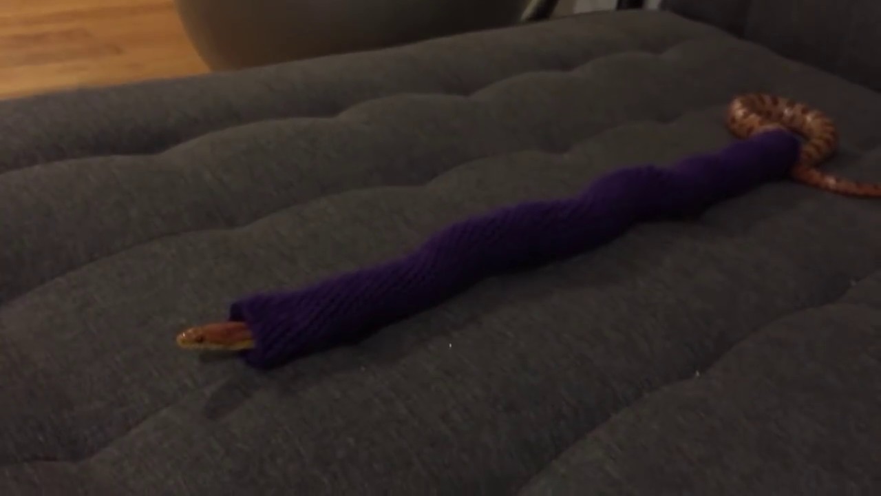 YouTube user RancorEmp shared this cute video of his pet corn snake, Spaghetti, showing off his new cozy purple sweater that he got for Christmas.