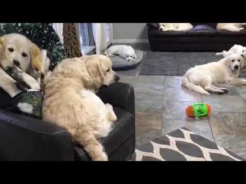 In this cute video from Texas, two golden retrievers get adorably confused when they notice the puppies printed on the new blanket their human brought home.