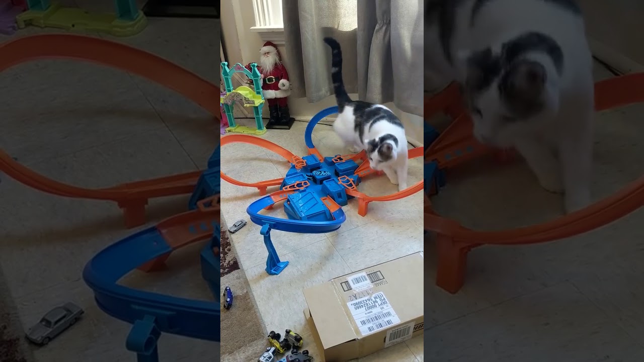 Harvey, the cat, gets a little overwhelmed a toy car zipping around the new Hot Wheels racetrack that his young human got for Christmas.