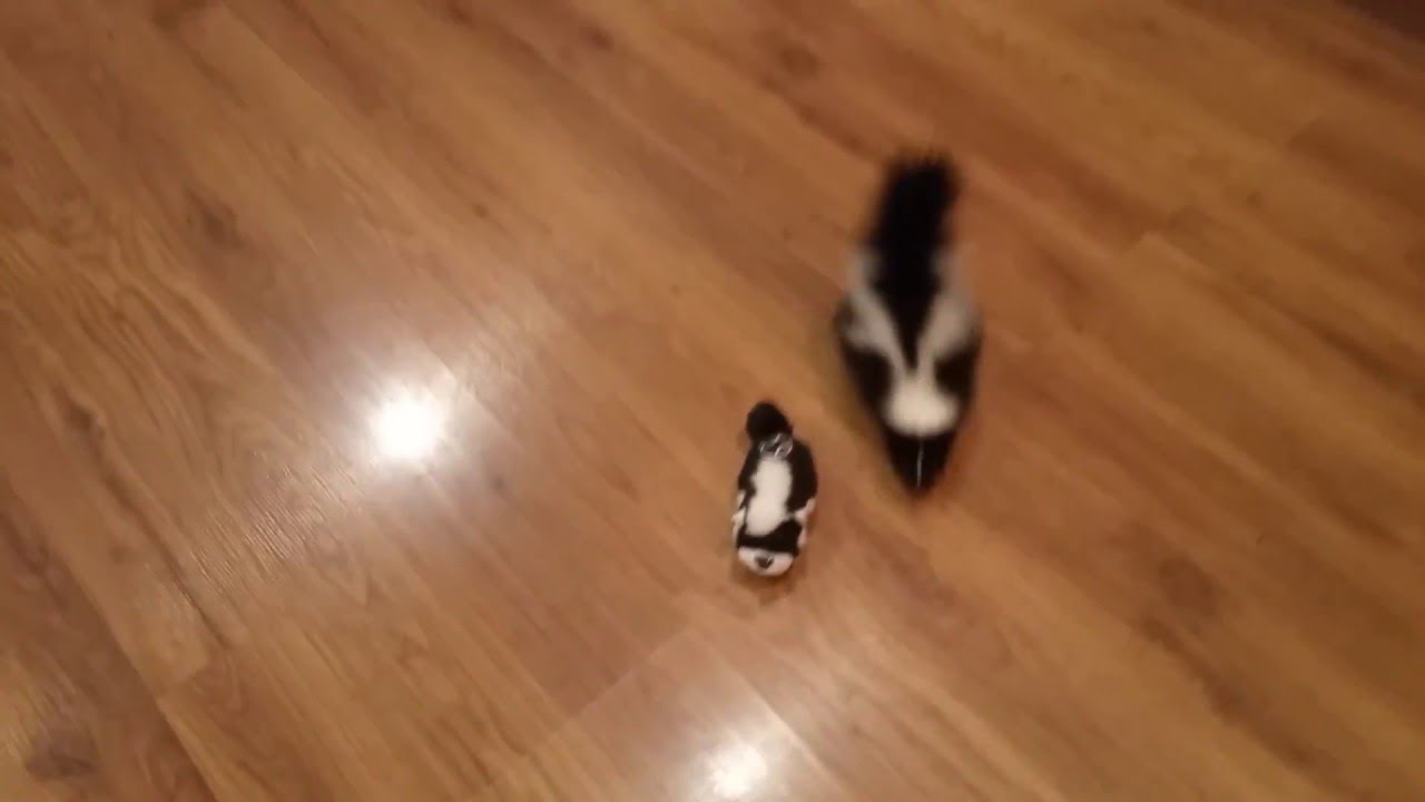 In this cute video from Silver City, New Mexico, a tiny, fluffy baby skunk makes friends and plays with an even tinier baby skunk remote-controlled toy.
