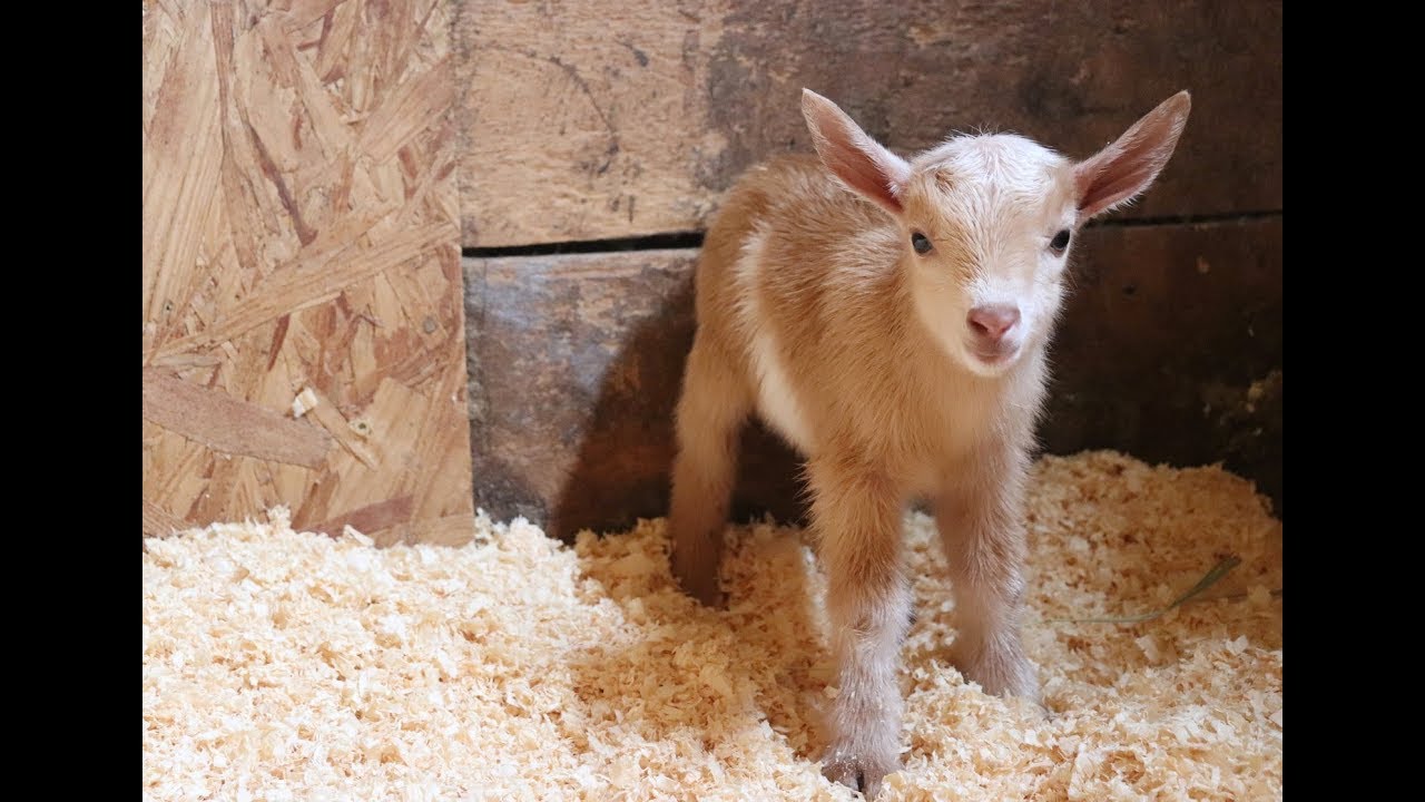 “Hector the Nigerian Dwarf baby goat is just 2 days old. His Mama Amelia Earhart is a little protective of her only kid (most goats have 3-4 babies at once!) While he waits for cousins to be born in the stall next door, he has befriended the three barn kittens. Mom is not so sure about this plan! The kittens did inspire him to climb the wood shavings bale for the first time!”