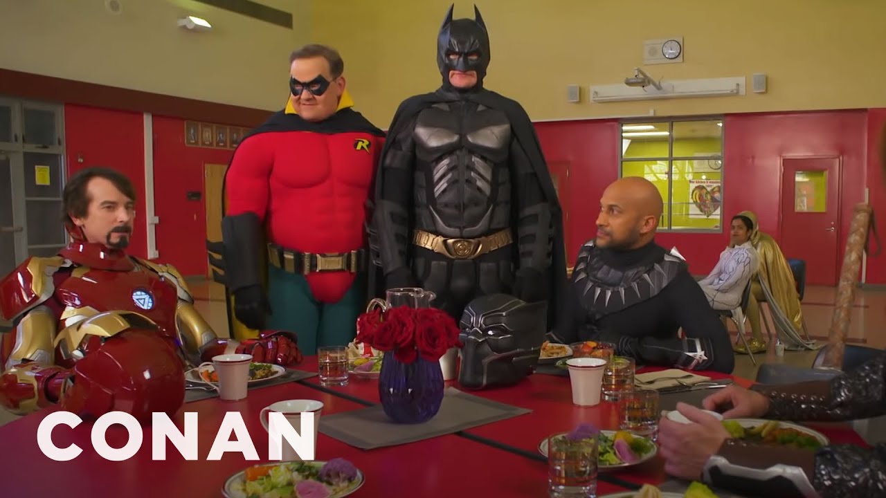 In this cold open sketch from Thursday night’s episode of Conan, Batman (Conan O’Brien) ditches his Justice League pals, Superman, Cyborg, and Aquaman, to try to earn a seat at the much cooler Marvel Universe table.