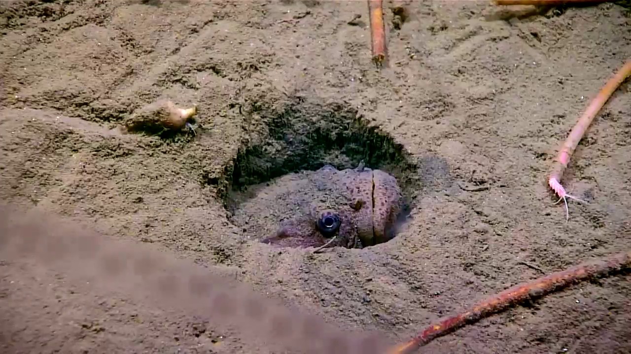 “This video, collected during Dive 16 of the Windows to the Deep 2018 expedition on June 30, 2018, highlights a benthic fish (Atlantic Midshipman, Porichthys plectrodon) dwelling in a burrow, snatching a large midwater fish (barracuda in the family Paralepididae) with quill worms as onlookers.”