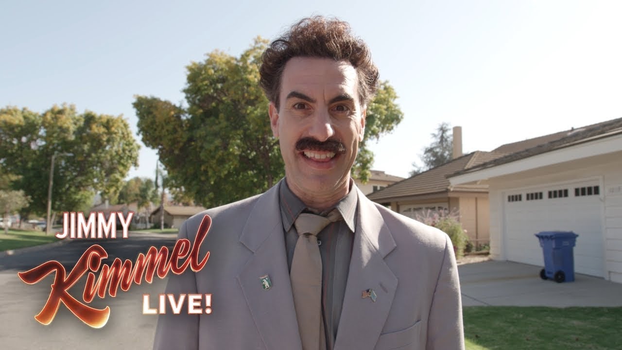 In this clip from Tuesday night’s episode of Jimmy Kimmel Live, Sacha Baron Cohen’s Kazakhstani alter ego, Borat, goes door-to-door in an affluent community in Los Angeles to speak with people about the current state of politics in the US.