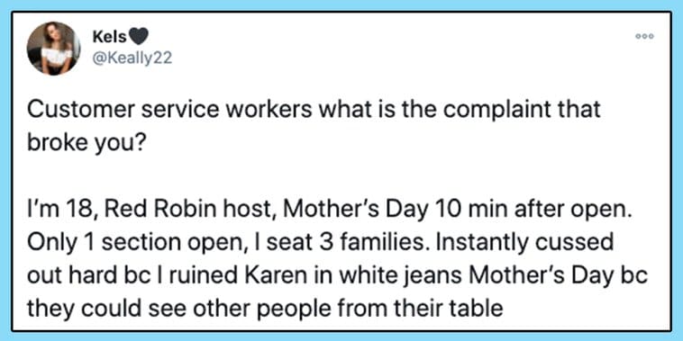 Twitter user @keally22 started a now-viral thread about customer service complaints and experiences that totally decimated the workers’ spirits.