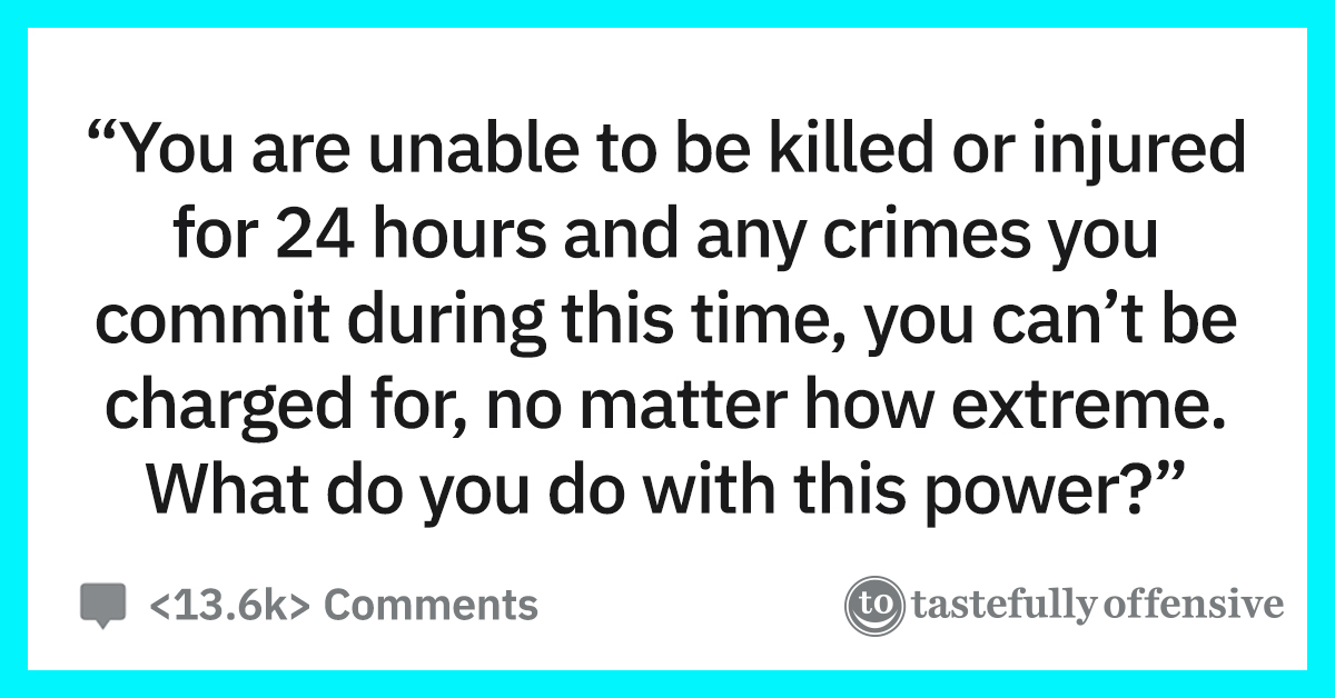 “You are unable to be killed or injured for 24 hours and any crimes you commit during this time, you can’t be charged for, no matter how extreme. What do you do with this power?”