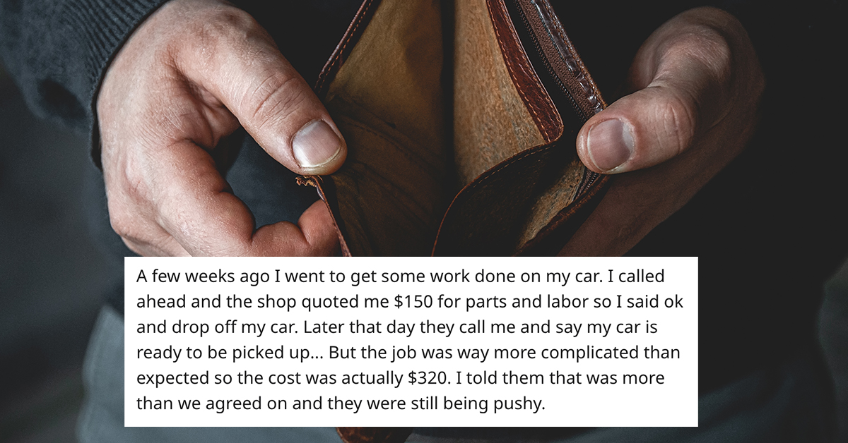 A few weeks ago I went to get some work done on my car. I called ahead and the shop quoted me $150 for parts and labor so I said ok and drop off my car. Later that day they call me and say my car is ready to be picked up… But the job was way more complicated than expected so the cost was actually $320. I told them that was more than we agreed on and they were still being pushy.