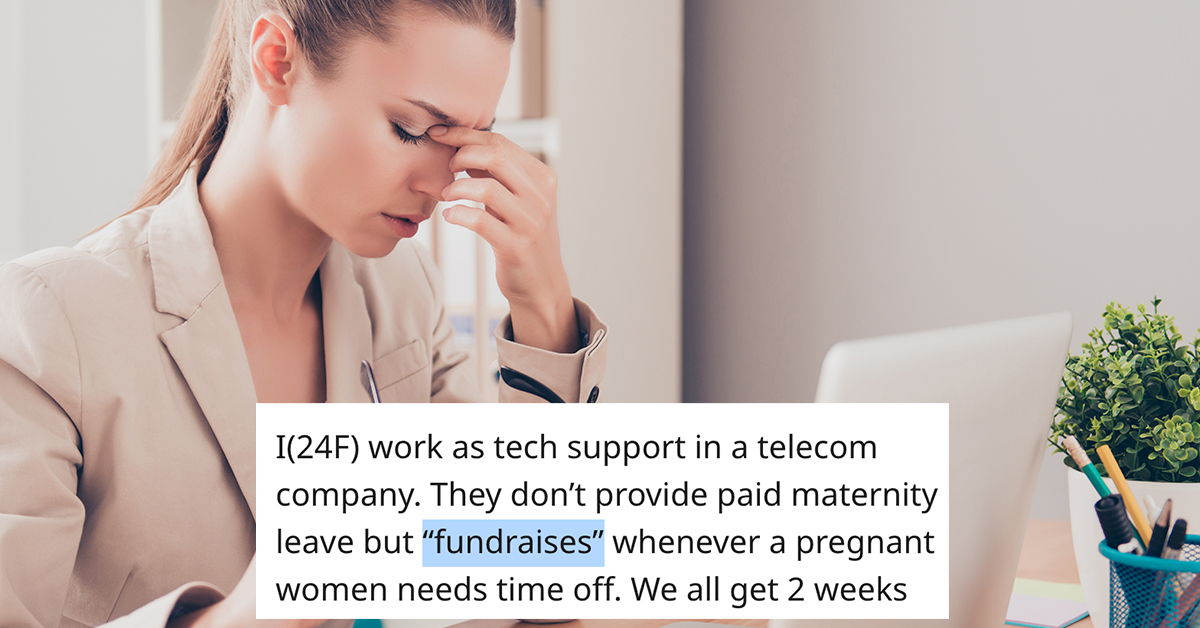 “I (24, female) work as tech support in a telecom company. They don’t provide paid maternity leave but “fundraise” whenever a pregnant women needs time off. We all get 2 weeks vacation 5 sick days and 3 PTO but my pregnant coworker used up some of it already.”
