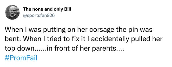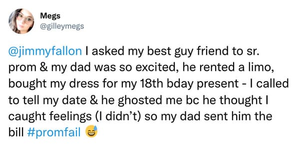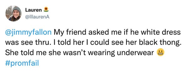Every Thursday Jimmy Fallon asks his audience to participate in “Tonight Show Hashtags” in which they share a story using the hashtag he provides. Recently, he asked his followers to share their #PromFail stories and fans delivered. Here are some of the funniest prom fails Tonight Show fans shared.