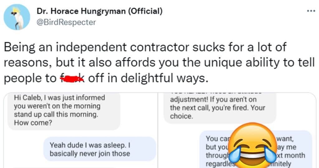 Tweets Worker Puts The ‘Free’ In Freelancer By Telling Off A Manager Who Scolded Him About Missing Morning Meetings ByMike April 21, 2023